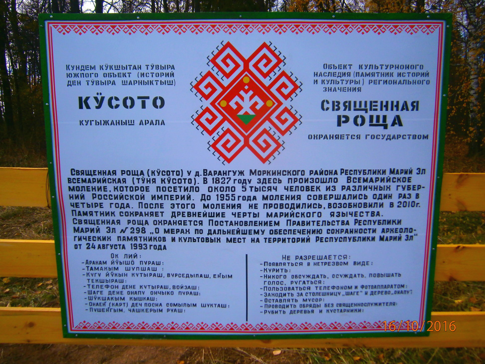 Varanguzhin lehdolla on “maailman” asema. Siellä järjestetään palveluksia kerran kolmessa vuodessa. Tiedetään, että vuonna 1827 paikalla järjestettiin suuri palvelus, joka kokosi yhteen yli 5000 maria eri paikkakunnilta. Paikalliset aktivistit ovat kart Georgi Arhipovin, johdolla pitäneet hyvää huolta lehdosta: tavallisen siivoamisen lisäksi he ovat pystyttäneet infotauluja ja rakentaneet aidan hiiden ympärille.
