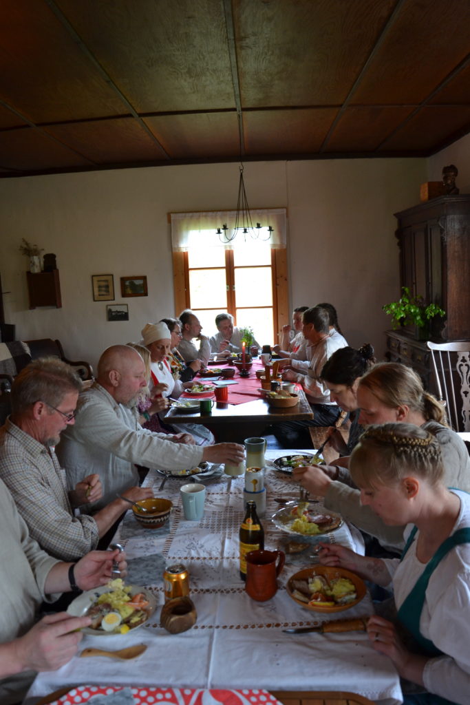 Töiden ohella juhlaan kuuluivat myös vanhan kansan keväiset toimet: seremonialliset kylviäiset toukoleipineen, sahdin maistelu ja kesän toivottaminen tervetulleeksi valkean äärellä musiikista nauttien. Pitopöytä notkui herkullista ruokaa ja hirsisaunan löylyt lämmittivät juhlakansaa. Päästinpä juhlan lopuksi vielä tutustumaan vanhaan längelmäkeläiseen kaivokseen, josta louhittu kiveä kovasimiin. Juhlaan osallistui niin uusia kuin vanhoja Taivaannaulan jäseniä.