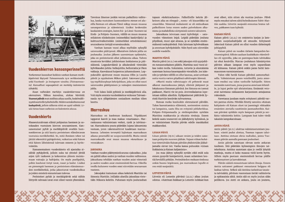 Tämänvuotiseen kalenteriin on ikuistettu erilaisia perinteisiä rakennuksia, joita on löytynyt kylistä ympäri Suomen. Kuvat on poimittu Finna-hakupalvelun kautta, ja valikoimaan on pyritty ottamaan mahdollisimman laajasti huomioon pihapiiristä usein löytyneet erilaiset rakennukset. Myös sisäkuvia on hyödynnetty talvenajan kuvissa.