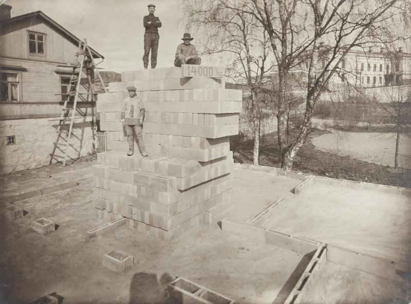 Rakennuksen koekuormitus Turussa toukokuussa 1913, muurarina Frans Wigren. Turun kaupunginmuseo, Public Domain.