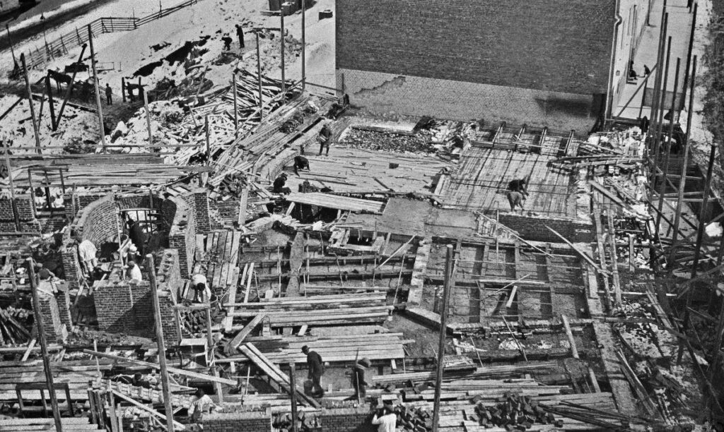 Suuri joukko muurareita ja muita työmiehiä rakentaa asuinkerrostaloa vuonna 1926 Helsingissä Ahlqvistinkadun (vuodesta 1928 Oksasenkatu) kulmassa, osoitteessa Temppelikatu 15. Helsingin kaupunginmuseo, Public Domain.