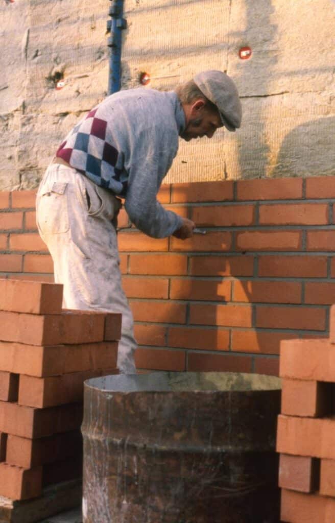 Muurari muuraamassa tiiliseinää Keravalla 1980-luvun loppupuolella. Kuvaaja: Timo Laaksonen. Keravan museopalvelut, Creative Commons BY-NC-ND 4.0.