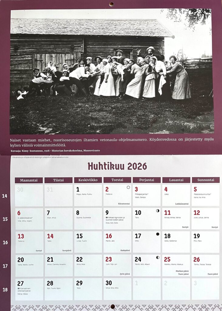 Tämänvuotiseen kalenteriin on ikuistettu erilaisia kansanhuveja ympäri Suomen. Kuvat on poimittu Finna-hakupalvelun kautta, ja valikoimaan on pyritty ottamaan mahdollisimman laajasti huomioon kansanomaiset vapaa-ajan huvitukset.