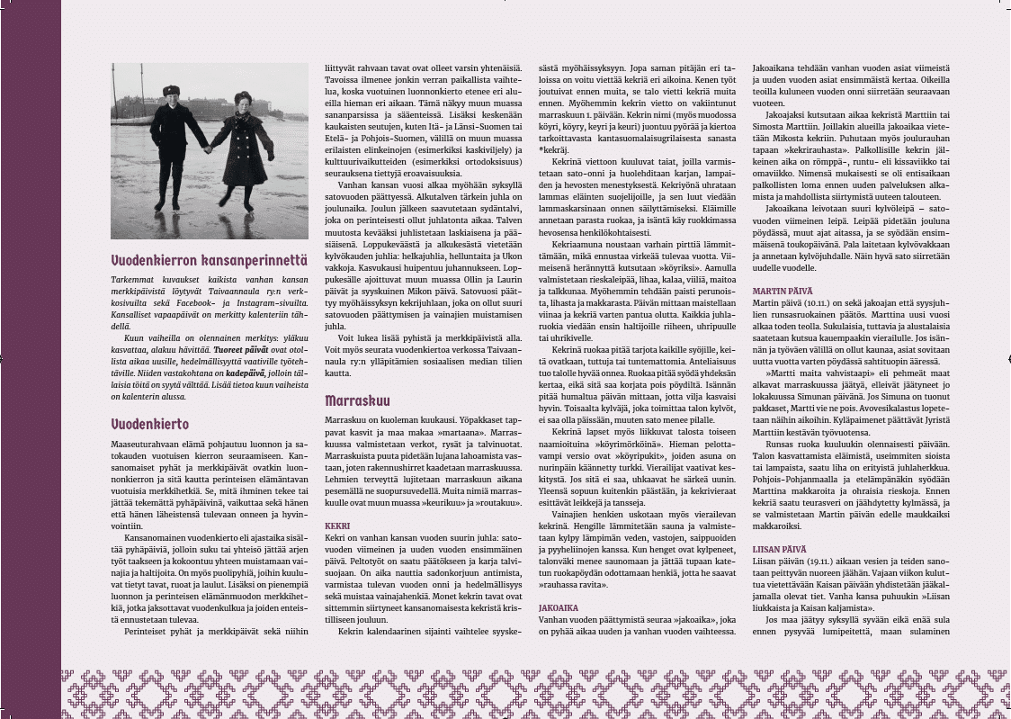 Seinäkalenterin vakiovarustukseen kuuluu runsas tietopaketti suomalaisesta kansanuskosta ja kansanperinteestä. Ostamalla kalenterin tuet Taivaannaula ry:n toimintaa ja suomalaisen henkisen perinteen ja perinnekulttuurin säilymistä.