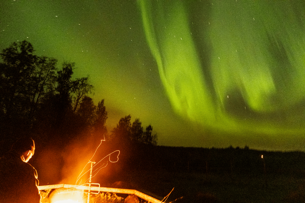 Kolilla vieraillessani yövyin Kolin juurella telttailulle osoitetulla paikalla. Yön pimetessä lämmittelimme vielä hetken nuotion äärellä ja pian saimmekin todistaa myös toisenlaista loimua, kun valtavat revontulet täyttivät taivaan. Kolin lisäksi myös revontuliin liittyy valtavasti kansantaruja ja mytologiaa ja tuntuikin aivan erityislaatuiselta päästä nauttimaan näin merkittävistä luonnon elementeistä. Revontulien leikkisät aallot lumosivat kauneudellaan, ja tässä kuvassa saivat kaverikseen sinkoilevien kipinöiden kuviot.”