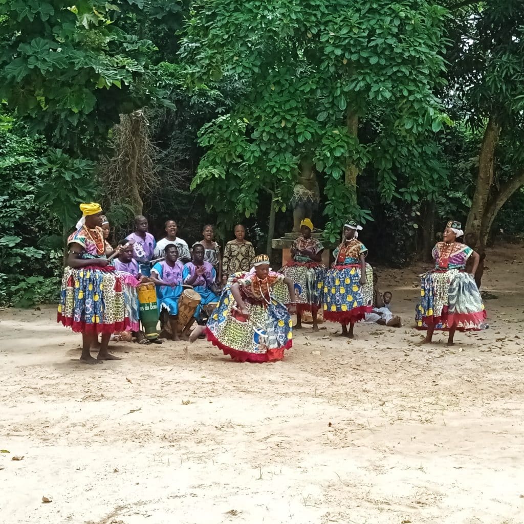 Seuraavaksi meidät vietiin tutustumaan Kpassen pyhään metsään. Metsä on muurein aidattu ja sisältää monta eri jumalkuvaa korokkeilla. Meille esiteltiin eri jumalia ja todistimme myös initioitavien kunnioituksenosoituksen tulkkiamme kohtaan, joka osoittautuikin korkea-arvoiseksi Mami Watan (vedenemän) papittareksi, kun metsän initioitavat nuoret osoittivat hänelle kunnioitustaan.