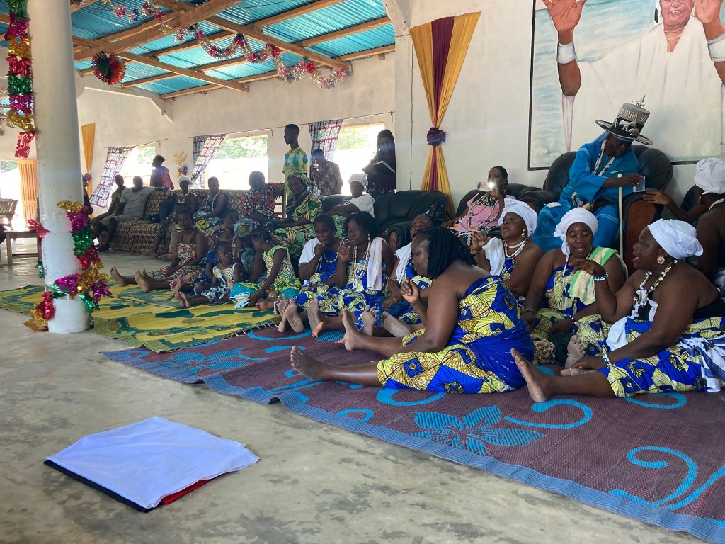 Päivä oli kuitenkin vielä aluillaan ja siirryimme Cotonousta taas kerran Ouidahiin, jossa tapasimme toisen paikallisen kuninkaan Dagbo Hounon Houna II:n. Tapaamisen piti olla lyhyt aamupäivän kestävä vierailu, mutta kuningas hoveineen otti meidät vastaan erittäin juhlallisesti ja vierailu kesti monta tuntia. Saimme voimakkaan läpileikkauksen beniniläisestä perinteisestä kuninkaallisesta kulttuurista, johon kuului tanssiminen ja laulaminen. Erityisesti laulamista oli joka välissä, joskus jopa kesken kuninkaan puheenvuoron.